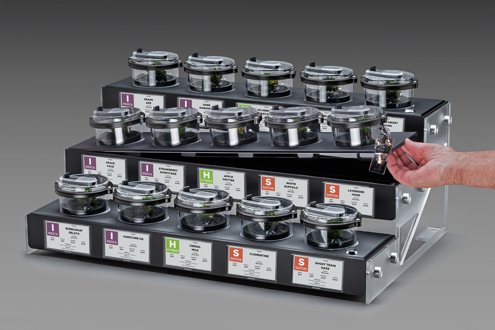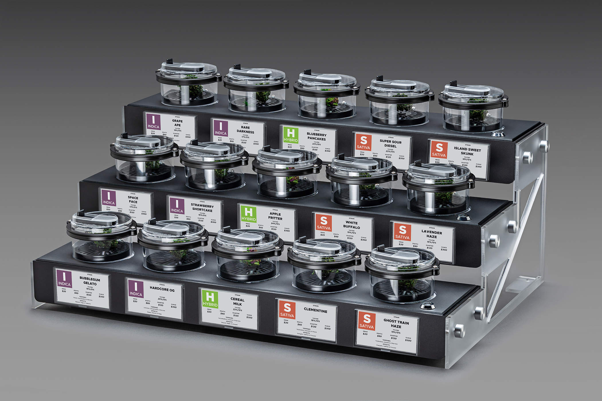 The Bud Pod Bar™ mounts to your counter and is lit by cool white LED's that produces a beautiful hue; the display is highly efficient, and eye appealing, as it showcases 15 strains of flower or extract using our popular Canna-Pod®, Puffer Pod®, or Puff-X Pod™ sniff jars. Your customers can easily pick up a Pod for closer inspection, review the strains information, and sniff the products terpene aroma while examining it through the Pod’s built-in magnifier. After viewing, the display’s security tethers retract and guide the Pod back into its home position.