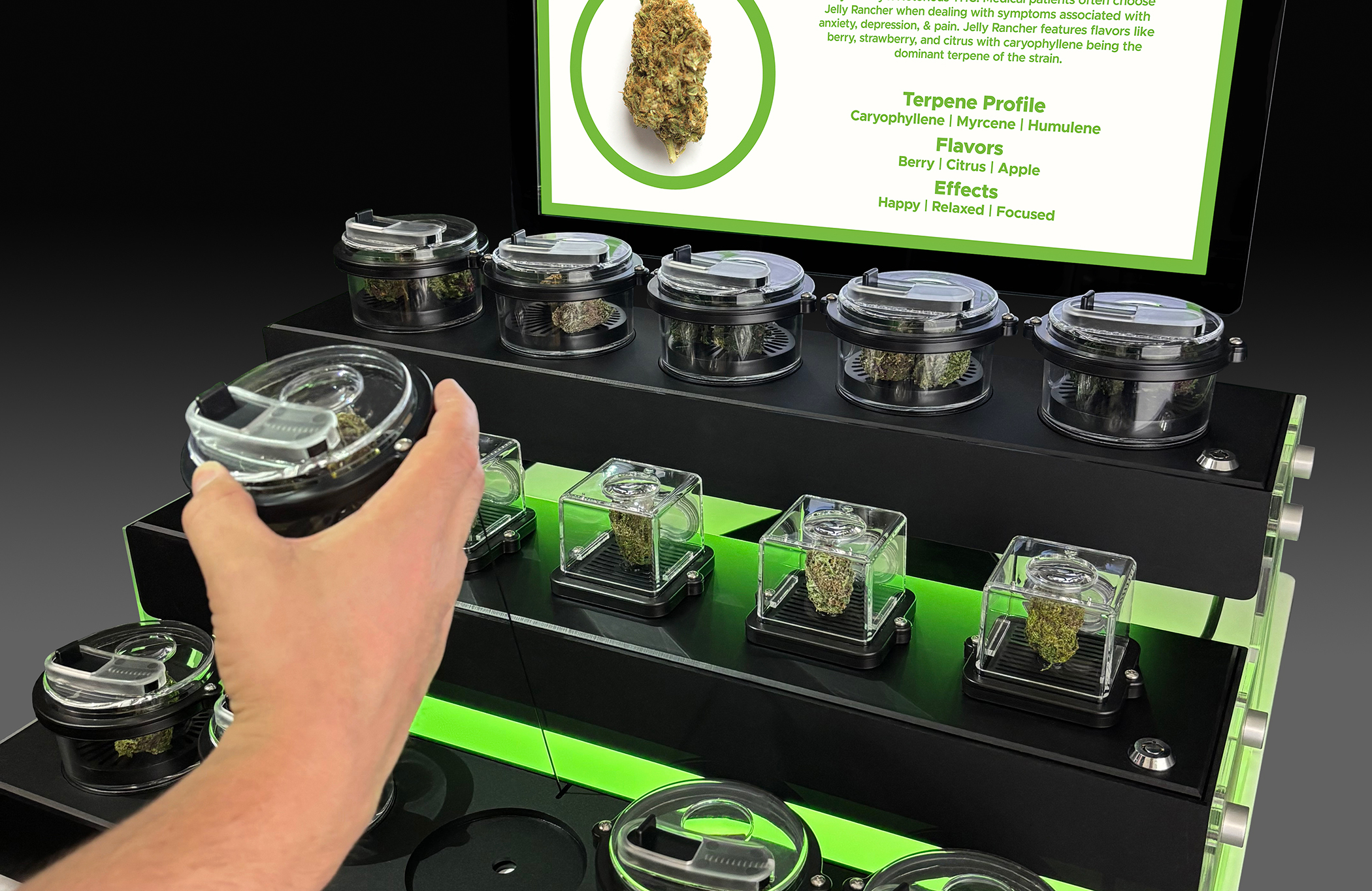 Ready to transform your store? Elevate your instore experience and boost your bottom line with intelligent digital displays! Introducing the Cann-O-Vision, an interactive product showcase that will engage, educate, and drive sales like never before. This visionary Bud Bar Display is specially designed to deliver the ultimate customer experience offering the opportunity to smell the terpenes, examine the trichomes, and now explore detailed product information. Well-informed consumers make smarter purchasing decisions, experience greater satisfaction with their choices, and are significantly more likely to become repeat customers.